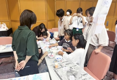 折り染め体験でうちわ作りや、マーブリングの技法でしおりや置き人形もつくれます。